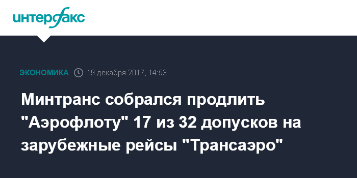 Москва. 19 декабря. INTERFAX.RU - Межведомственная комиссия (МВК) при Минтрансе РФ на ближайшем заседании рассмотрит вопрос о продлении "Аэрофлоту" и дочерней "России" 17 из 32 допусков на международные маршруты, доставшихся им от "Трансаэро".