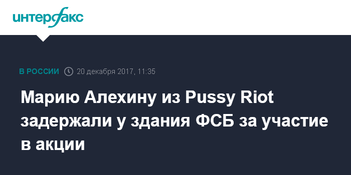 Москва. 20 декабря. INTERFAX.RU - Участница Pussy Riot Мария Алехина задержана в ходе акции у здания Федеральной службы безопасности в Москве. Об этом сообщила участница группы Ольга Борисова.