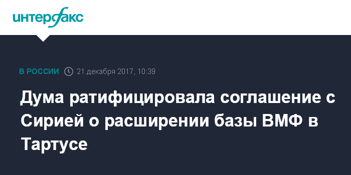 Соглашение между РФ и Сирией о расширении территории пункта материально-технического обеспечения (МТО) ВМФ РФ в районе порта Тартус и заходах военных кораблей РФ в территориальное море, внутренние воды и порты Сирии президент РФ Владимир Путин внес на ратификацию в Госдуму 13 декабря.