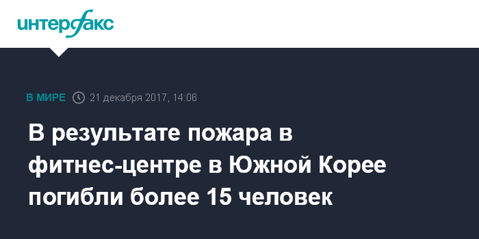 Москва. 21 декабря. INTERFAX.RU - Не менее 16 человек погибли и более 10 пострадали в результате пожара в фитнес-центре в южнокорейском городе Чечхон. Об этом сообщил в четверг южнокорейский телеканал YTN