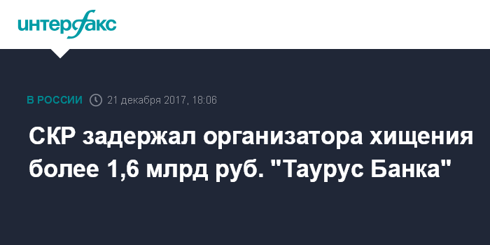 СКР задержал организатора хищения более 1,6 млрд руб. "Таурус Банка"