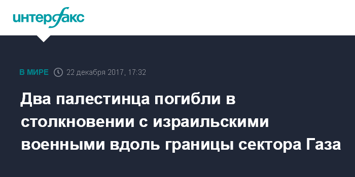 Москва. 22 декабря. INTERFAX.RU - По меньшей мере двое палестинцев погибли в результате столкновений с израильскими военнослужащими на границе сектора Газа, сообщает в пятницу газета "Гаарец".