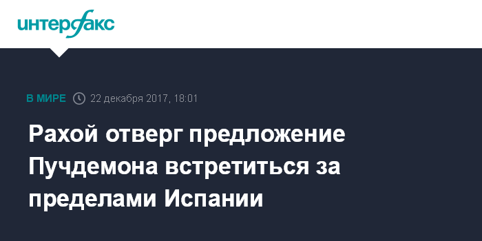 Москва. 22 декабря. INTERFAX.RU - Премьер-министр Испании Мариано Рахой отклонил предложение экс-главы Каталонии Карлеса Пучдемона провести переговоры за пределами Испании, сообщает в пятницу газета El Pais.