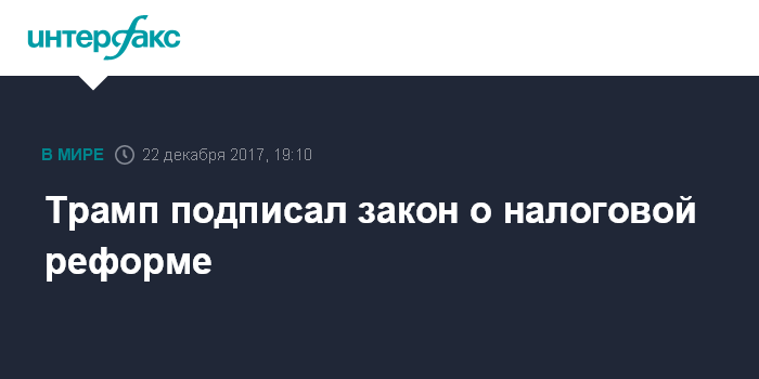 Москва. 22 декабря. INTERFAX.RU - Президент США Дональд Трамп подписал закон о налоговой реформе, одобренный ранее на этой неделе Конгрессом, сообщают американские СМИ.