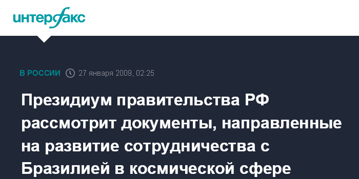 Президиум правительства РФ рассмотрит документы, направленные на развитие сотрудничества с Бразилией в космической сфере