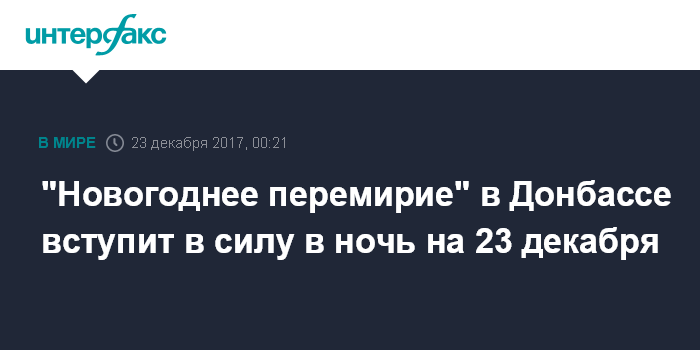 Москва. 23 декабря. INTERFAX.RU - Режим прекращения огня должен быть установлен в Донбассе в ночь на субботу. На заседании 20 декабря Трехсторонняя контактная группа (ТКГ) подчеркнула необходимость обеспечения мира и спокойствия в связи с грядущими рождественскими и новогодними праздниками и подтвердила приверженность сторон соблюдению режима прекращения огня в Донбассе с 00:00 по киевскому времени (01:00 мск 24 декабря) 23 декабря 2017 года.