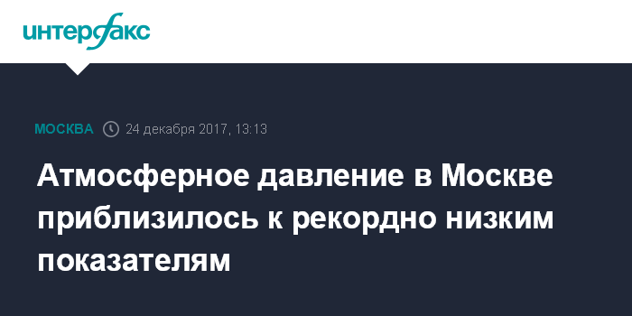 "В полдень 23 декабря атмосферное давление на базовой метеостанции на ВДНХ составляло 743 мм рт. ст., а к 12:00 воскресенья оно опустилось до 722 мм", - уточнил собеседник агентства.