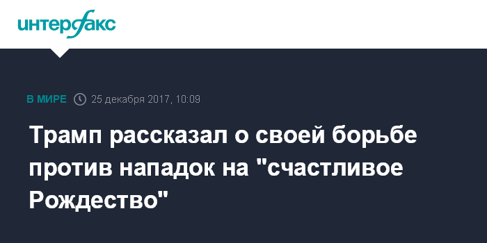 "Люди вновь с гордостью говорят: "Счастливого рождества". Я горд тем, что я возглавил борьбу против нападок на наше дорогое сердцу и прекрасное поздравление. Счастливого Рождества!", - написал Трамп в твиттере.