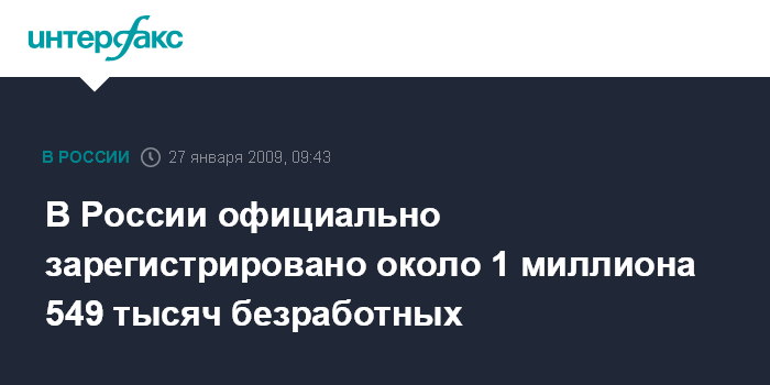 Москва.27 января. INTERFAX.RU - По последним данным мониторинга рынка труда, который проводит Минздравсоцразвития РФ, численность официально зарегистрированных безработных в России составила около 1 миллионов 549 тысяч человек.
