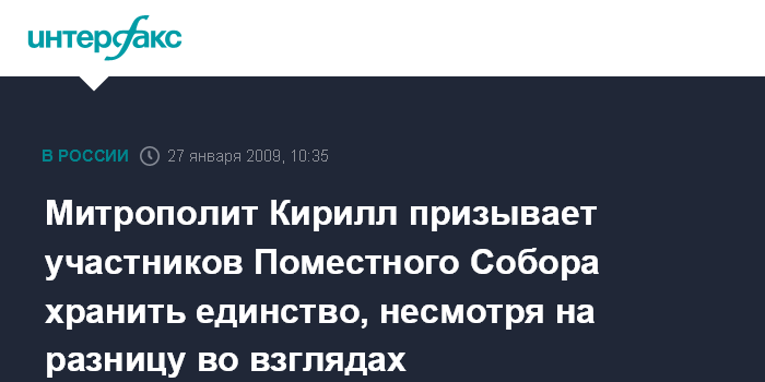 Москва. 27 января. INTERFAX.RU - Местоблюститель патриаршего престола митрополит Смоленский и Калининградский Кирилл обратился к участникам Поместного Собора с призывом хранить единство духа, вне зависимости от разницы убеждений.