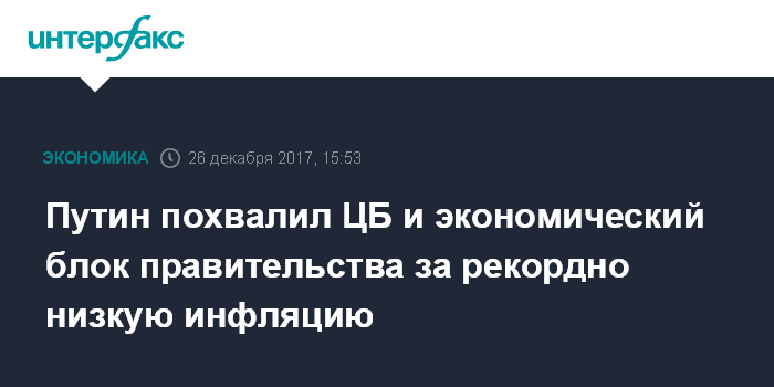 Москва. 26 декабря. INTERFAX.RU - Россия добилась рекордно минимальной инфляции за всю свою историю, и это заслуга как Центробанка, так и правительства, заявил президент РФ Владимир Путин.