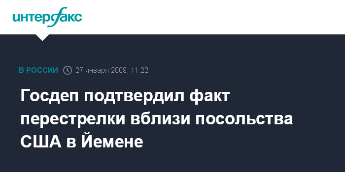 Вашингтон. 27 января. INTERFAX.RU - Госдепартамент США подтвердил, что в понедельник вечером возле посольства США в Йемене произошла перестрелка между йеменской службой безопасности, охраняющей посольство, и группой неизвестных лиц.