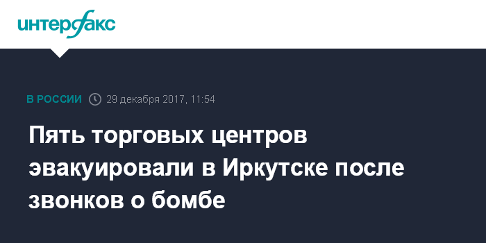 Москва. 29 декабря. INTERFAX.RU - Посетители и работники пяти торговых центров были эвакуированы в пятницу в Иркутске после поступления анонимных телефонных звонков о якобы заложенных взрывных устройствах, сообщил "Интерфаксу" информированный источник.