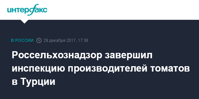 Москва. 29 декабря. INTERFAX.RU - Специалисты Россельхознадзора 29 декабря завершили в Турции инспектирование производителей томатов, готовых поставлять свою продукцию в РФ, сообщает служба.