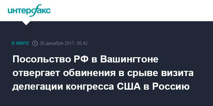 Посольство РФ в Вашингтоне отвергает обвинения в срыве визита делегации конгресса США в Россию
