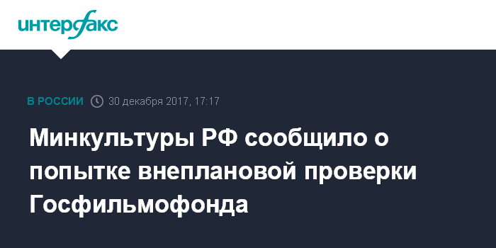 Москва. 30 декабря. INTERFAX.RU - Минкультуры РФ пыталось провести внеплановую ведомственную комплексную проверку деятельности Госфильмофонда за 2012-2017 годы, в организации утверждают, что проверка была незаконной.