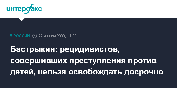 Москва. 27 января. INTERFAX.RU - Глава Следственного Комитета при прокуратуре РФ Александр Бастрыкин считает, что рецидивисты, совершившие преступления в отношении детей, не могут получать условно-досрочное освобождение из мест лишения свободы.
