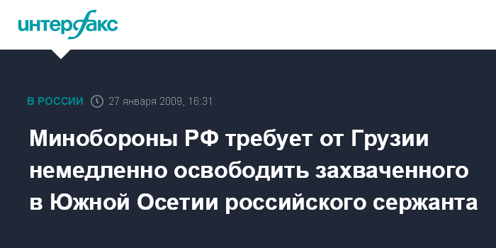 Москва. 27 января. INTERFAX.RU - Минобороны РФ требует от Грузии незамедлительного освобождения захваченного в Южной Осетии младшего сержанта Александра Глухова, заявил "Интерфаксу-АВН" во вторник временно исполняющий должность (врид) начальника управления пресс-службы и информации военного ведомства полковник Александр Дробышевский.