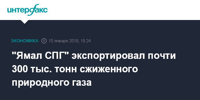 Москва. 10 января. INTERFAX.RU - "Ямал СПГ" с момента своего официального запуска в начале декабря 2017 года экспортировал четыре партии сжиженного природного газа (СПГ) общий объемом почти 300 тыс. тонн.