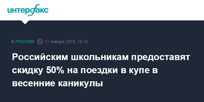Москва. 11 января. INTERFAX.RU - Дети в возрасте от 10 до 17 лет в дни весенних школьных каникул смогут совершить поездку в купейном вагоне поезда дальнего следования со скидкой 50%, сообщает в четверг Федеральная пассажирская компания (ФПК, "дочка" РЖД).