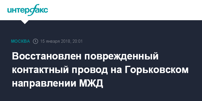 Москва. 15 января. INTERFAX.RU - Работы по восстановлению контактной сети на Горьковском направлении Московской железной дороги завершены, сообщили в пресс-службе МЖД.