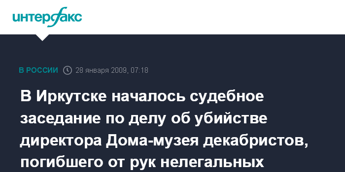 Иркутск. 28 января. ИНТЕРФАКС-СИБИРЬ - В Иркутском областном суде началось судебное заседание по делу об убийстве директора Дома-музея декабристов Евгения Ячменева, задушенного гастарбайтерами.