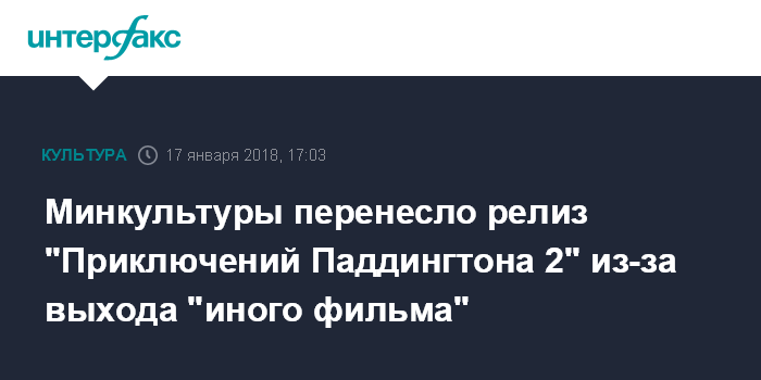 Москва. 17 января. INTERFAX.RU - Минкультуры за день до премьеры перенесло релиз фильма "Приключения Паддингтона 2" в связи с тем, он совпадал с выходом в прокат "иного фильма".