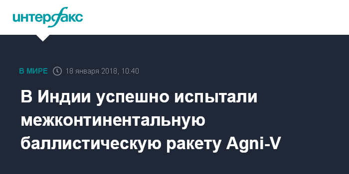 Москва. 18 января. INTERFAX.RU - Индия осуществила очередной запуск межконтинентальной баллистической ракеты Agni-V, способной нести ядерный боезаряд, сообщает в четверг газета The Times of India.