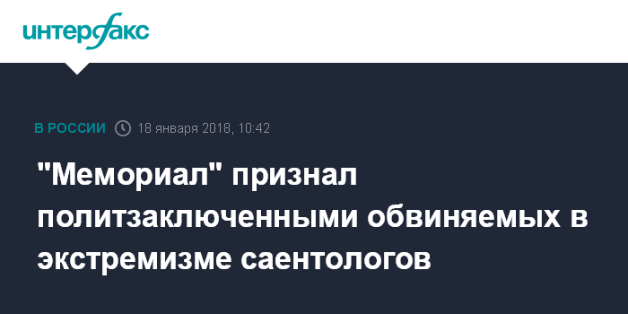 Москва. 18 января. INTERFAX.RU - Правозащитный центр "Мемориал" признал политзаключенными пятерых петербургских саентологов, которых ФСБ обвиняет в экстремизме. Об этом сообщил участвующий в деле в качестве защитника адвокат Иван Павлов, руководитель Команды 29.