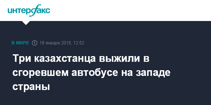 Москва. 18 января. INTERFAX.RU - По уточненным данным, в сгоревшем автобусе в Актюбинской области Казахстана находились трое граждан Казахстана, все они выжили, сообщили агентству "Интерфакс" в ДЧС области.