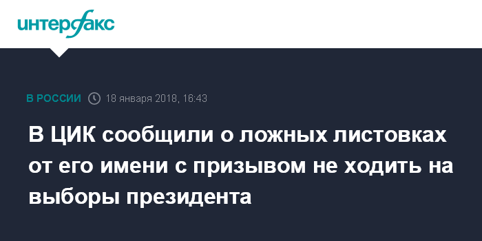 Москва. 18 января. INTERFAX.RU - ЦИК России предупредил о распространении листовок на улицах и материалов в интернете, где от имени руководства Центризбиркома граждан призывают проигнорировать выборы президента страны.