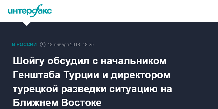 Москва. 18 января. INTERFAX.RU - Министр обороны России генерал армии Сергей Шойгу на встрече в Москве обсудил с начальником Генштаба ВС Турции генералом Хулуси Акаром и директором национальной разведывательной организации Турции Хаканом Фиданом ситуацию на Ближнем Востоке, сообщает Минобороны РФ в четверг.