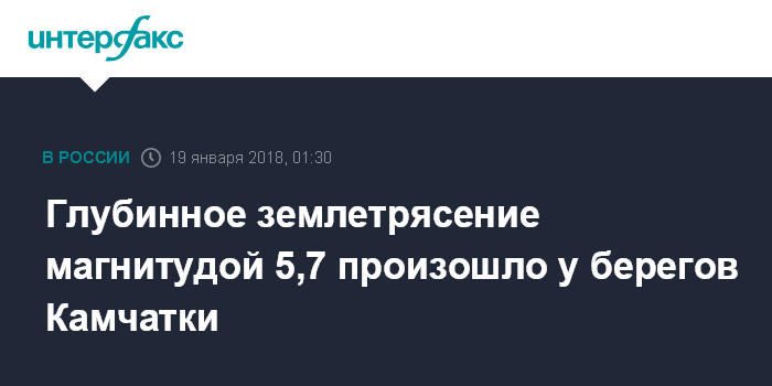 Москва. 19 января. INTERFAX.RU - Сейсмологи зарегистрировали землетрясение магнитудой 5,7, произошедшее у западного побережья Камчатки, сообщили агентству "Интерфакс" в пятницу в Камчатском филиале Геофизической службы Российской академии наук (РАН).