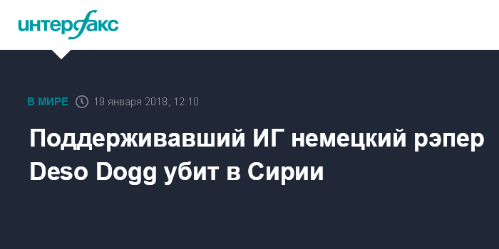Москва. 19 января. INTERFAX.RU - Рэпер из Германии Денис Кусперт (Deso Dogg), воевавший на стороне террористической группировки "Исламское государство" (ИГ, запрещена в РФ), убит в Сирии, передает в пятницу телеканал "Аль-Арабия".