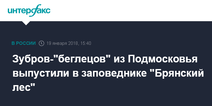 Москва. 19 января. INTERFAX.RU - Одиннадцать зубров, переехавших из Московской области, выпущены на волю в заповеднике "Брянский лес" после карантина и адаптации, сообщает пресс-служба "Приокско-Террасного заповедника".