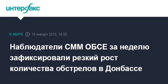 Москва. 19 января. INTERFAX.RU - За неделю в зоне боевых действий на востоке Украины наблюдатели Специальной мониторинговой миссии ОБСЕ зафиксировали резкий рост количества нарушений режима прекращения огня.