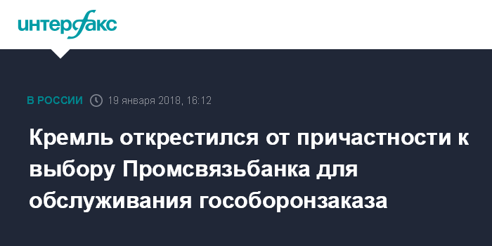 Москва. 19 января. INTERFAX.RU - Пресс-секретарь главы государства Дмитрий Песков заявил, что Кремль не имеет отношения к вопросу о выборе Промсвязьбанка в качестве главной финансовой структуры по обслуживанию гособоронзаказа.