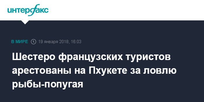 Москва. 19 января. INTERFAX.RU - Группа туристов из Франции арестована в Таиланде за запрещенную гарпунную ловлю охраняемого вида рыб, сообщает в пятницу издание The Phuket News.
