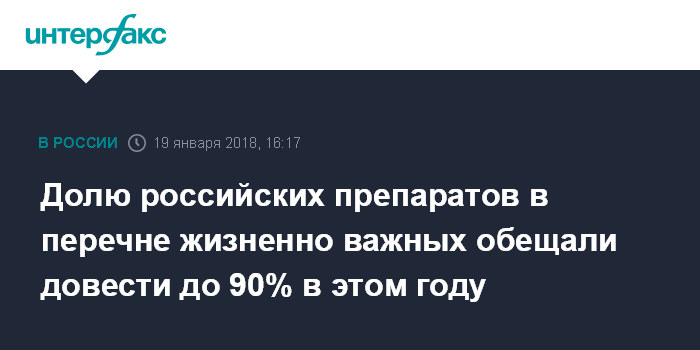 Москва. 19 января. INTERFAX.RU - Глава Минпромторга Денис Мантуров обещает, что в 2018 году доля лекарственных препаратов российского производства в перечне жизненно важных лекарств достигнет 90%.