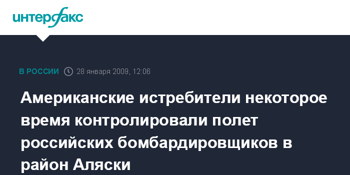 Москва. 28 января. INTERFAX.RU – Экипажи российских стратегических ракетоносцев, которые выполняли полет в нейтральные воды в район Аляски, сопровождали четыре истребителя американских ВВС.