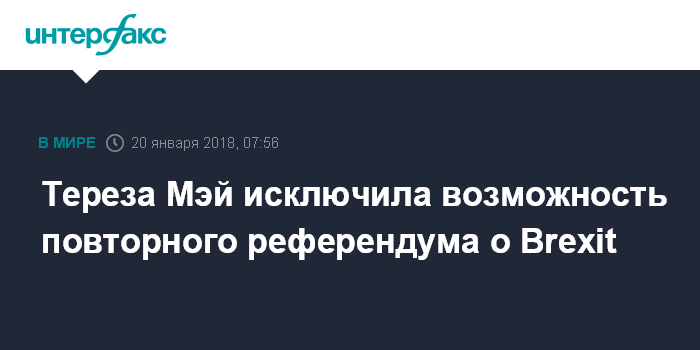 Москва. 20 января. INTERFAX.RU - Британский премьер-министр Тереза Мэй исключила возможность проведения повторого референдума о выходе Великобритании из состава ЕС; об этом говорится в интервью, которое политик дала изданию Bild.