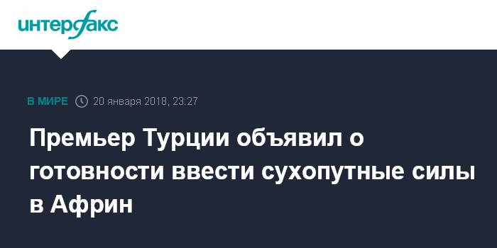 Москва. 20 января. INTERFAX.RU - Премьер-министр Турции Бинали Йылдырым заявил, что в воскресенье к операции "Оливковая ветвь" в сирийском Африне могут привлечь сухопутные части ВС Турции, сообщило в субботу агентство "Анадолу".