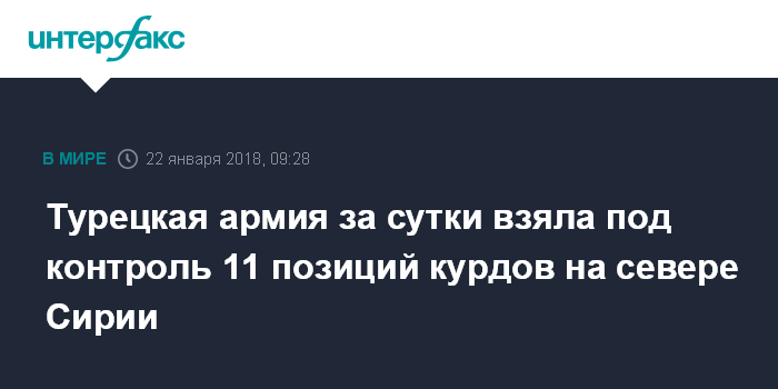 Москва. 22 января. INTERFAX.RU - Вооруженные силы Турции при поддержке Свободной армии Сирии за сутки военной операции в районе сирийского Африна установили контроль над 11 позициями курдов, сообщает Анатолийское агентство новостей.