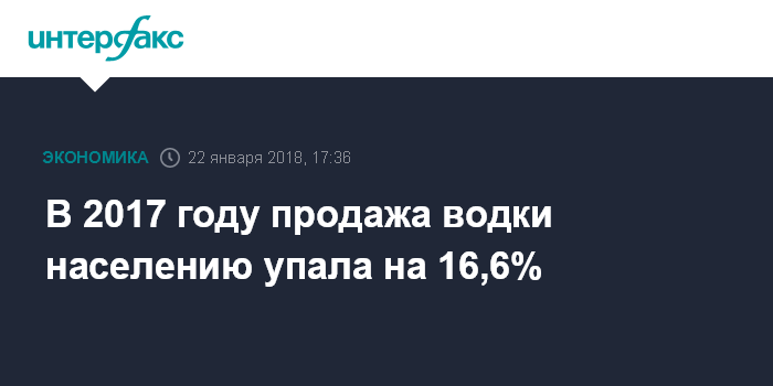 Как сообщили "Интерфаксу" в Национальном союзе защиты прав потребителей, водки было продано 67,5 млн декалитров (дал), что на 16,6% меньше, чем в 2016 году. Розничная продажа ликероводочных изделий крепостью до 25 градусов составила 2,551 млн дал (на 43,4% меньше, чем в 2016 году), ликероводочных изделий крепостью более 25 градусов - 5,3 млн дал (на 25,8% меньше).