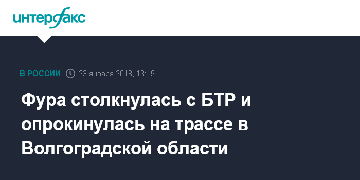 "ДТП произошло вчера в 16:05 в Калачевском районе. 29-летний водитель грузового автомобиля Freightliner Century с полуприцепом, следуя по федеральной автодороге "Волгоград-Каменск-Шахтинский" не предоставил преимущество в движении колонне транспортных средств, в результате чего столкнулся с БТР-80 под управлением 32-летнего военнослужащего", - сказал собеседник агентства.