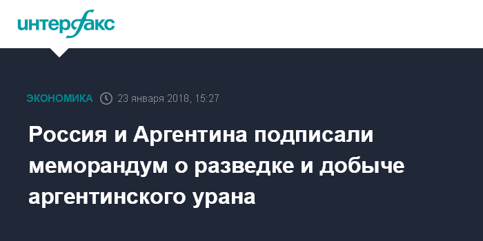 Москва. 23 января. INTERFAX.RU - Россия и Аргентина подписали меморандум о взаимопонимании по разведке и разработке урана, говорится в сообщении министерства иностранных дел, международной торговли и культа Аргентины.