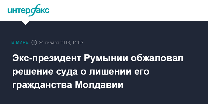 Москва. 24 января. INTERFAX.RU - Бывший президент Румынии Траян Бэсеску обжаловал в Апелляционной палате молдавской столицы решение суда сектора Ботаника Кишинева, который оставил в силе указ президента Игоря Додона о лишении его гражданства Молдавии.