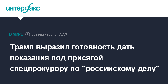 Москва. 25 января. INTERFAX.RU - Президент США Дональд Трамп заявил о готовности дать под присягой показания спецпрокурору по расследованию так называемого "российского дела" Роберту Мюллеру.