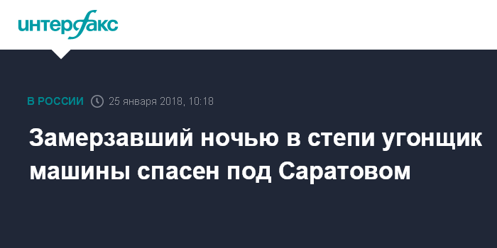 Москва. 25 января. INTERFAX.RU - Угонщик иномарки едва не погиб от обморожения в Дергачевском районе Саратовской области, его спасли полицейские. Об этом сообщает пресс-служба Главного управления МВД по региону в четверг.