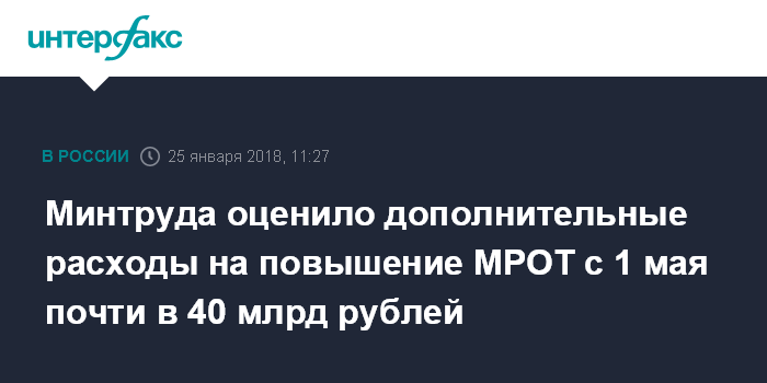 Москва. 25 января. INTERFAX.RU - Для повышения минимального размера оплаты труда (МРОТ) до уровня прожиточного минимума трудоспособного населения потребуется дополнительно почти 40 млрд рублей из федерального и региональных бюджетов.